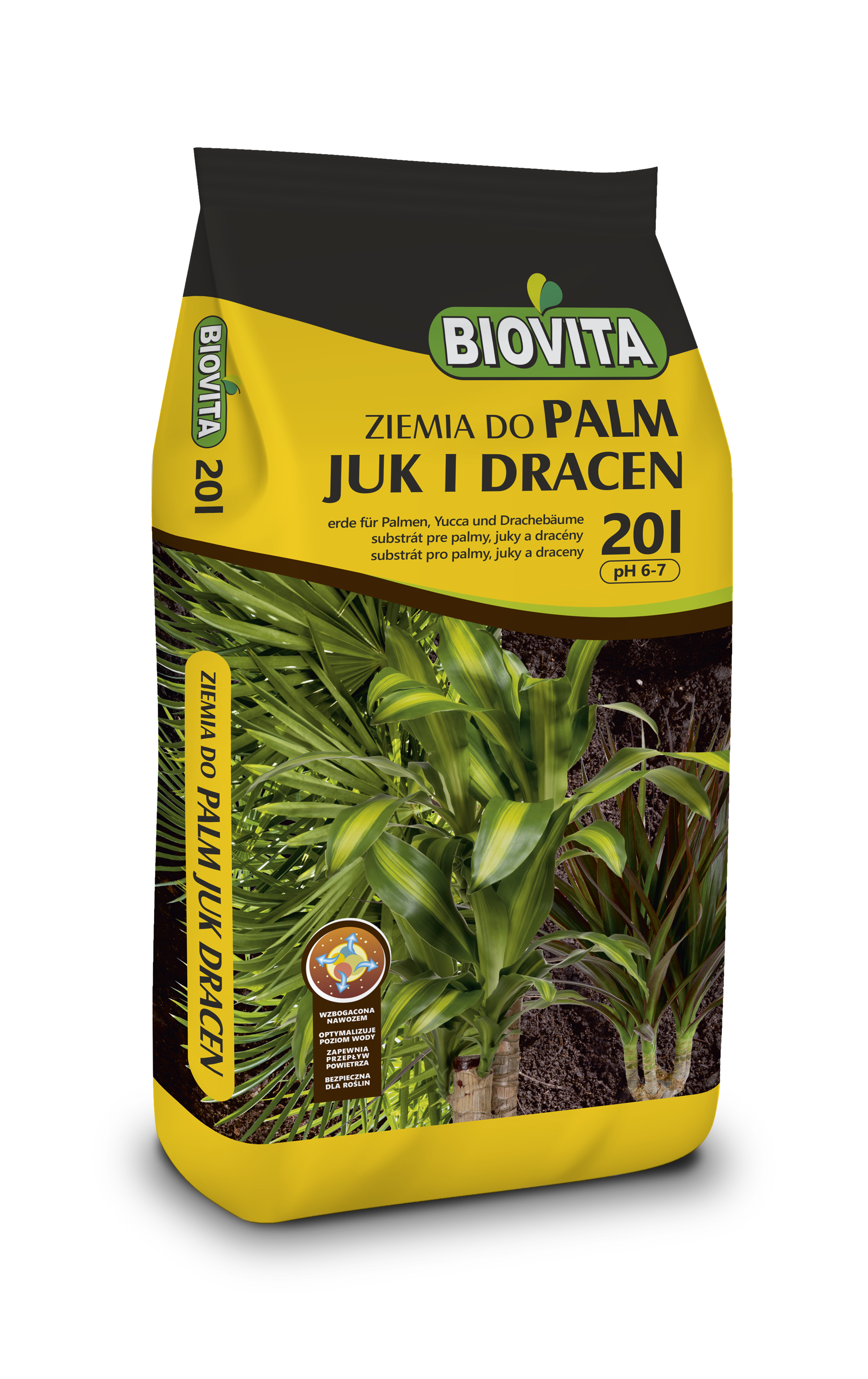 Ziemia do palm, juk i dracen BIOVITA to gotowe do użycia, sprawdzone, wieloskładnikowe podłoże przeznaczone do palm, juk i dracen, a także do fikusów i innych roślin zielonych. Odpowiednio dobrany skład chemiczny i fizyczny stwarza roślinom dogodne warunki rozwoju i wegetacji. Dodatek perlitu zapewnia konieczną dla tych roślin przepuszczalność. Ponieważ palmy nie „lubią stać w wodzie„ warto zastosować na dnie doniczki warstwę drenażu np. keramzyt Biovita.W okresie pełnej wegetacji należy regularnie podlewać i nawozić rośliny, w okresie zimowym zaprzestajemy nawożenia i ograniczamy podlewanie.